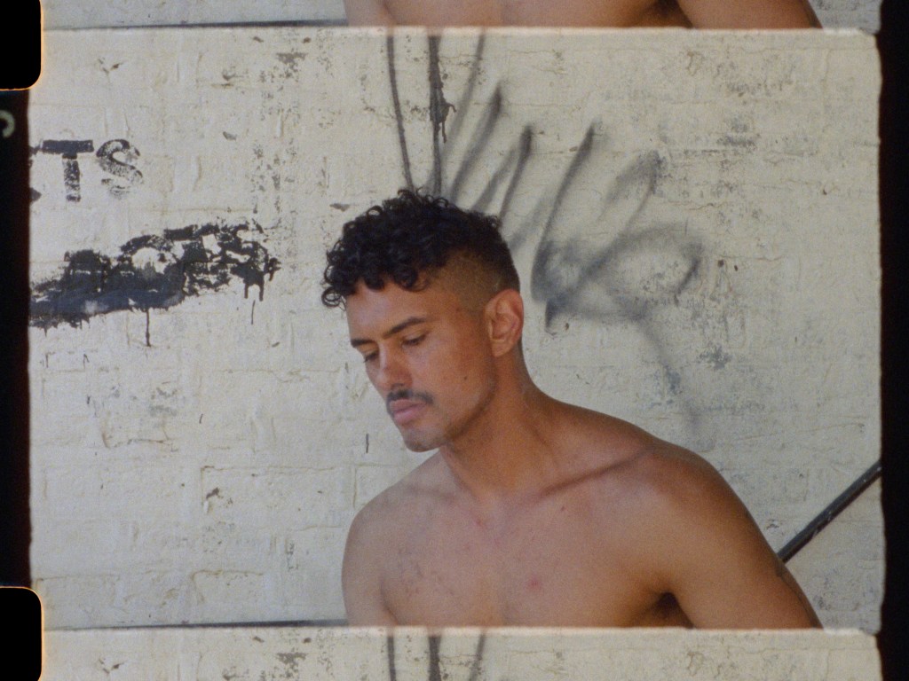 Frédéric Moffet sait ranimer la mémoire des disparus, l’inoubliable hommage à Montgomery Clift, de 2011, suffirait à le prouver avec la métaphore cinématographique sur des séquences de films interprétés par cet acteur, détruit par l’intolérance hollywoodienne autant que par l’accident de voiture qui le défigura. Cependant, c’est différemment qu’il s’empare de cette légende-ci, dont il relate les étapes en inscriptions type post-it, dans le champ où évolue un performer, Stevie Cisneros Hanley, en mémoire de Fred Herko et du film. Goddess of Speed, le titre au féminin, glisse le refus du genre imposé du danseur originel ; quant à la vitesse annoncée, F Moffet, se souvenant que Warhol projetait ses films à 24 images/seconde en vitesse ralentie à 16 images/seconde, il n’amplifie pas le tempo malgré la vitesse annoncée par le titre. Son film débute avec le son typique du projecteur avant celui de la recherche du « la » par un orchestre avant exécution que ne refuserait pas un Godard. Il opte pour le dytique, hormis un rare triptyque, enserrant le gros plan du visage du performer au regard plutôt dur — rappel de la mort à venir du premier performer, qui avait annoncé une « flying dance » et se jeta du haut de l’immeuble. Loin de la simple reprise de ce plan portrait, les deux autres ne retiennent que l’épaule en amorce à gauche et que le visage partiel à droite.