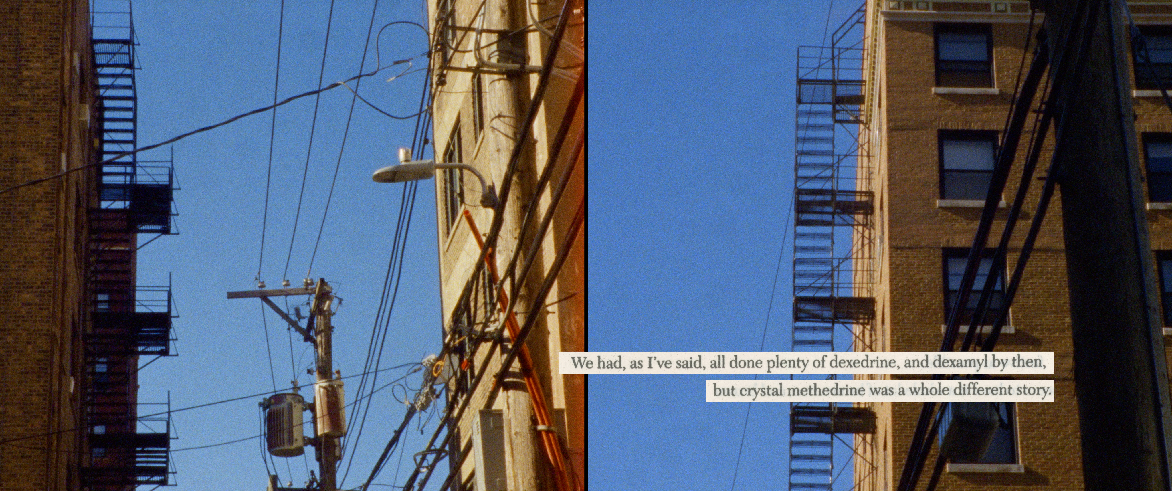 F. Moffet ne cache pas la réalité, il n’exclut pas les noms des médicaments et drogues auxquels s’adonnait Herko, il raconte son histoire et tisse ce rappel avec celui du film de Warhol dont on se souvient qu’il filmait tous ceux qui se rendaient à la Factory, dans leurs faits et gestes, sans demande autre. Minutes réunies dans les Screen Tests, où se reconnaissent des artistes comme Lou Reed ou Nico et les proches, amis, relations, amants de Warhol, ainsi que le poète John Giorno du mémorable Sleep, lui aussi de 1963, en plan fixe et temps réel sinon unique, ce que la prise de 10 minutes de la caméra ne peut. Et l’alternance d’immeubles et de performer oblige à citer Empire State Building, de 1964, durée de huit heures d’un « seul » plan du bâtiment new-yorkais éponyme.