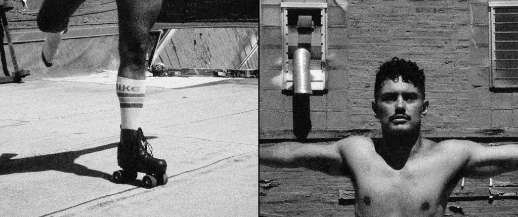 F. Moffet réactue l’action évoquée par Warhol, en filmant sur une terrasse typique de New York – l’alternance de plans en couleurs et selon des axes divers et quelque légère variation d’échelle, la situent sans ambiguïté. Le lieu est idoine, warholien avec les murs de briques, avec les escaliers métalliques extérieurs. Il le teinte parfois de rouge ou en efface l’image comme il le fait aussi du corps de l’homme pour un fond blanc. Il y invite ce corps masculin, connaissant son pouvoir de séduction. Il retient après un éclair de lumière, ce corps athlétique simplement vêtu d’un short et de chaussettes, dans ses allers et retours, dans sa nécessité de s’y reprendre puisque chaussé d’un seul patin, dans ses tentatives de mimer le vol de l’ange – ou l’ornement de voiture luxueuse – de partir du mur ou de s’y rattraper et dans ses arrêts, de profil ou avec un regard frontal. Il en fait le portrait en acte, yeux décidés, petite moustache, déterminé à recommencer encore et encore, après avoir chaussé le seul patin, indice de performance et non de simple distraction.